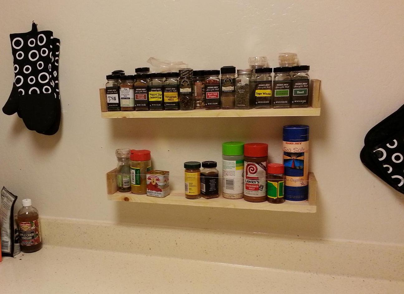 So I finally got around to making a proper spice rack for the kitchen. The old one was overflowing and spices were falling everywhere, but luckily there is a home depot a few miles nearby. You almost can’t see it in the picture, but there is an acrylic sheet keeping the spices from falling out, while also leaving the spice labels fully legible.