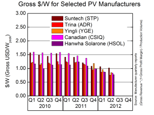 In June 2012 I compiled my research into the quarterly reports of the major players in photovoltaics, and even though Suntech still hasn’t released its final Q2 2012 numbers, I think it is time for an update. Companies such as Suntech, Trina, Yingli, Canadian, Sharp, and Hanwha Solarone focus on revenue from module sales and so a rough idea of their cost to produce panels can be found in their production numbers and cost of revenue.