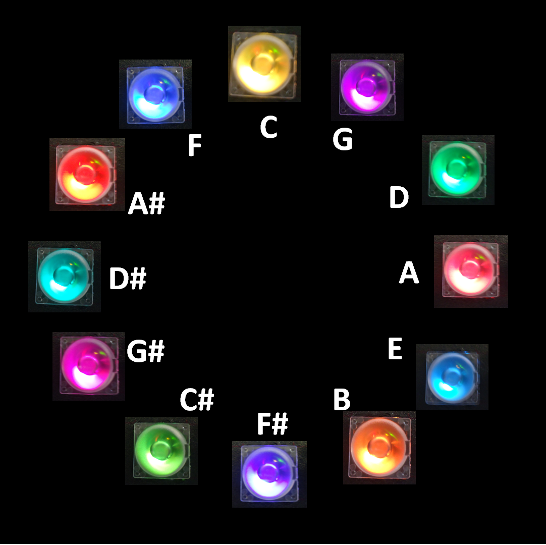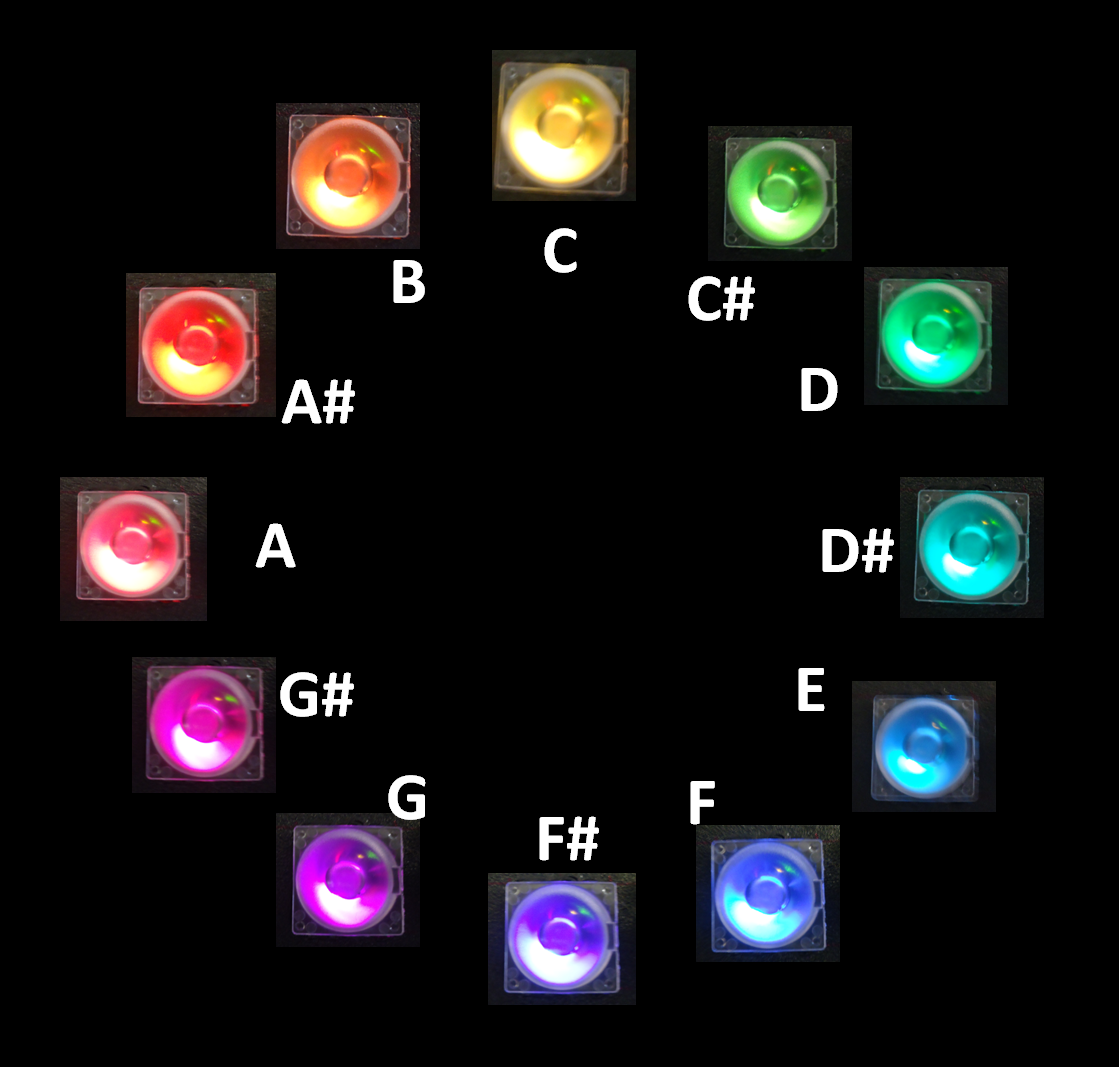 Here is the color wheel used by my electronic instrument, Abella. When the music box is playing “C”, the pitch display appears yellow. Middle “C” is set at 262 Hz, high “C” at 523, and low “C” at 131 Hz, and each is displayed yellow. The remaining notes occupy a RGB-CMY color space.