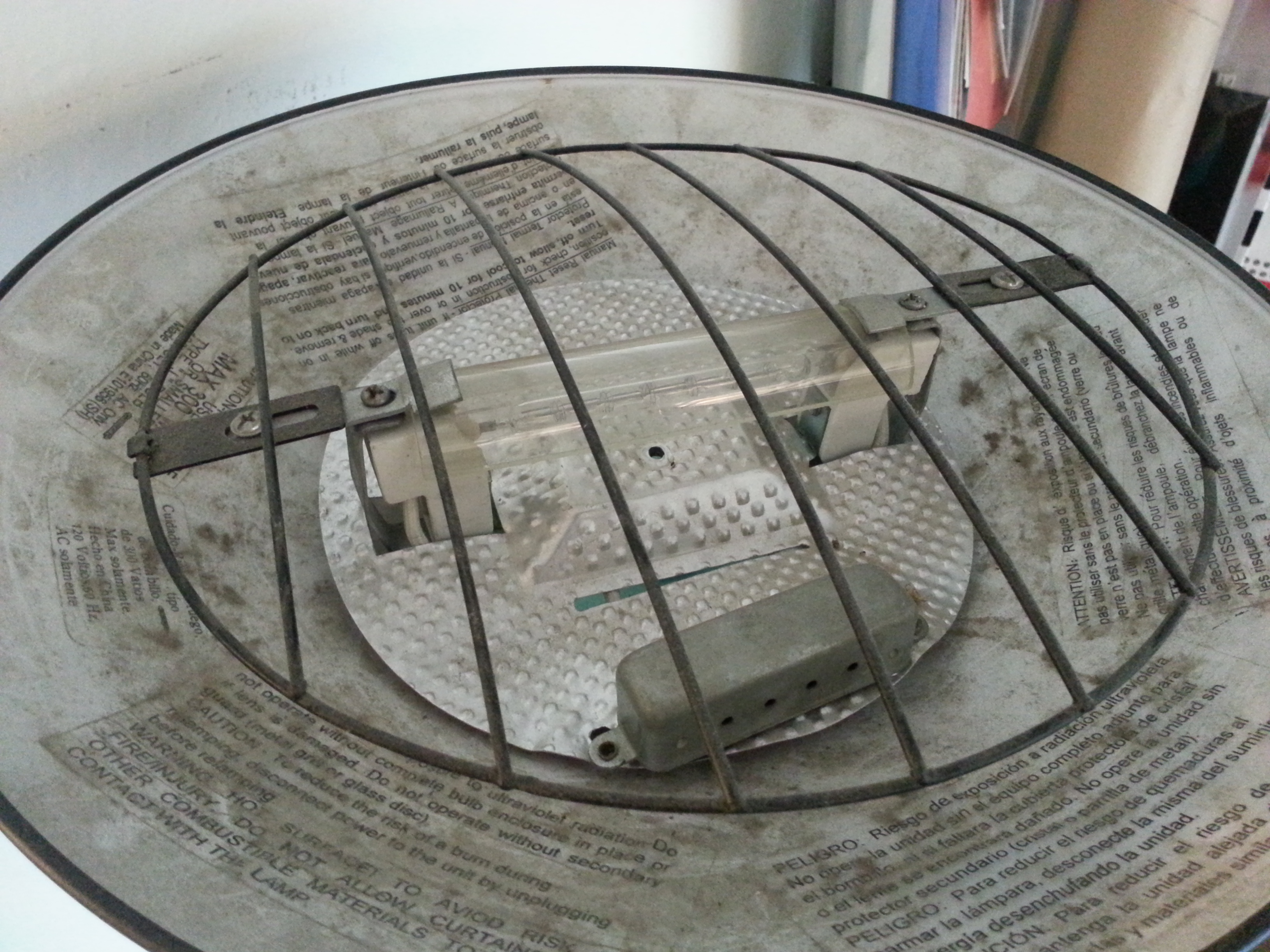 First, it’s time to remove some halogen components. In this picture we can see the metal guard rails, the quartz UV blocking pane, the halogen bulb, the ceramic contact housing, and the reflective base with thermal runaway sensor.