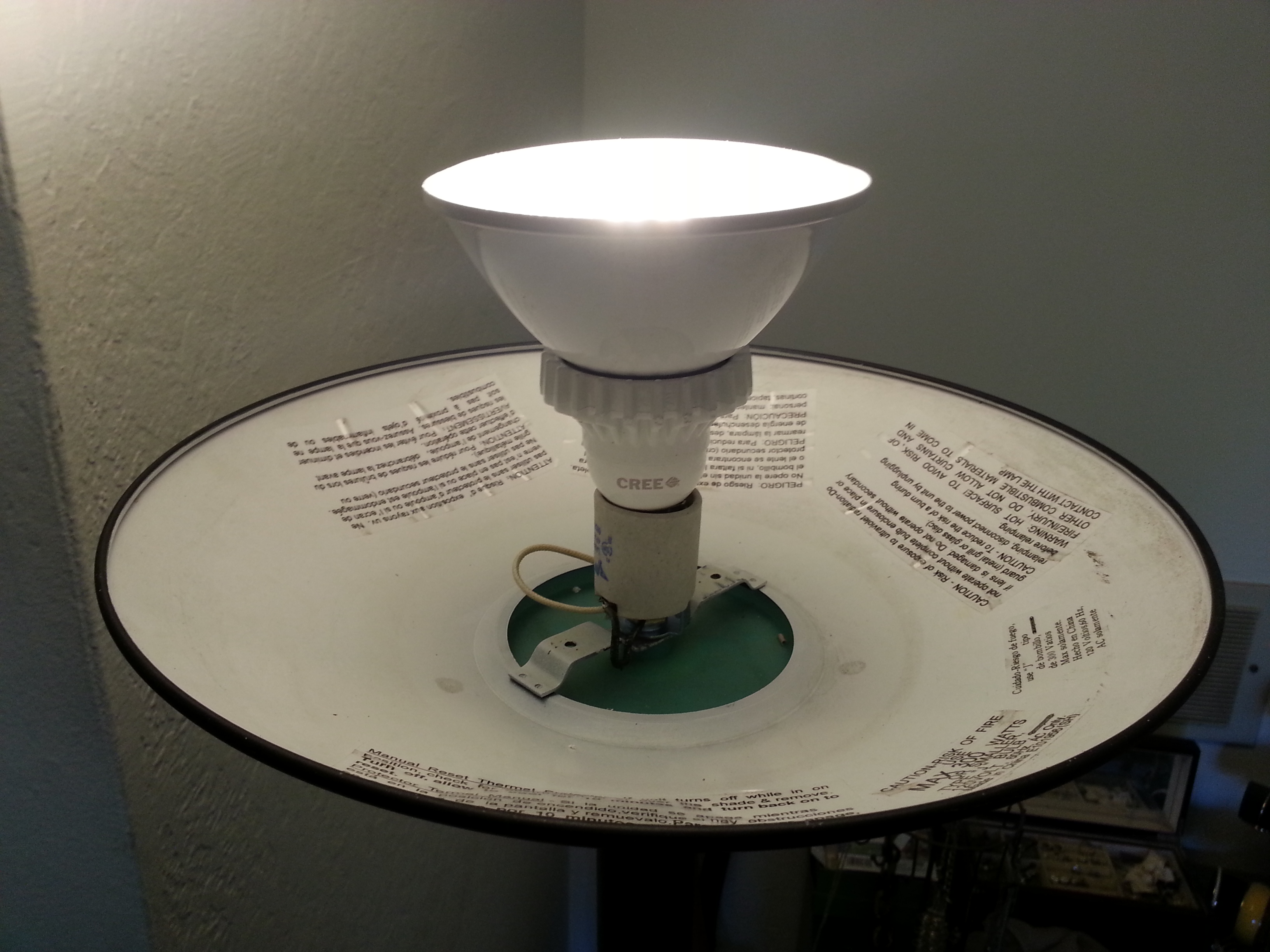 We have two 300W halogen flood lamps in the house, but I decided it was time for an LED upgrade. I selected the Cree 18W (90W equivalent) flood lamp as the replacement. I wanted to keep the 6ft tall lamp stand and dimmer, but remove the halogen housing, thermal runaway circuit and reflectors.
