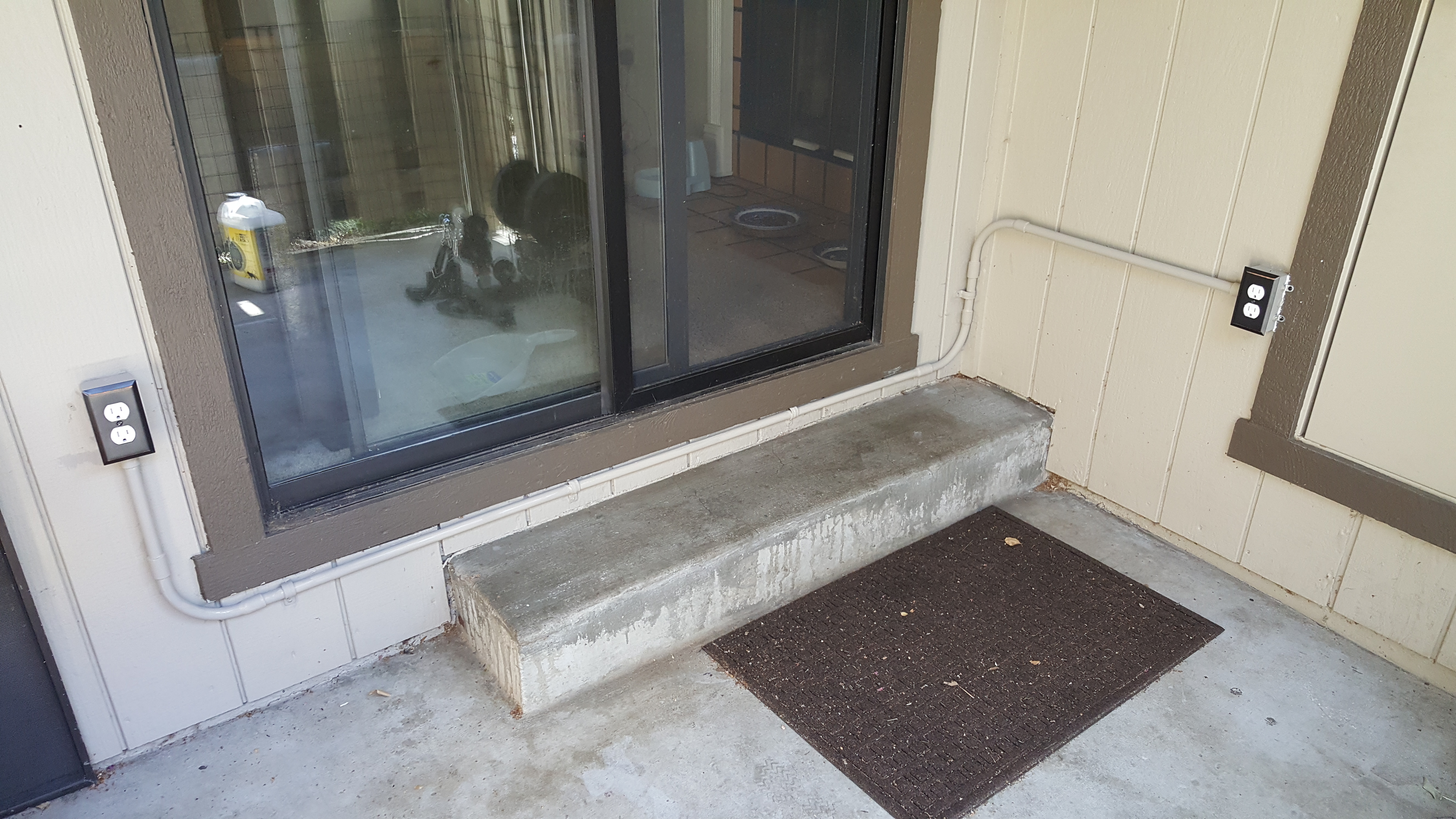 Always disengage electrical power from the circuit – confirm with multimeter! Then remove old hardware and install the first new device box and outlet. Feed the wire into the PVC and start cutting and cementing each piece into place. Then install the remote device box and outlet. For a great look, bring in a color sample from your wall and Home Depot can mix up a custom match! Use the color-matched exterior paint to make the conduits invisible.