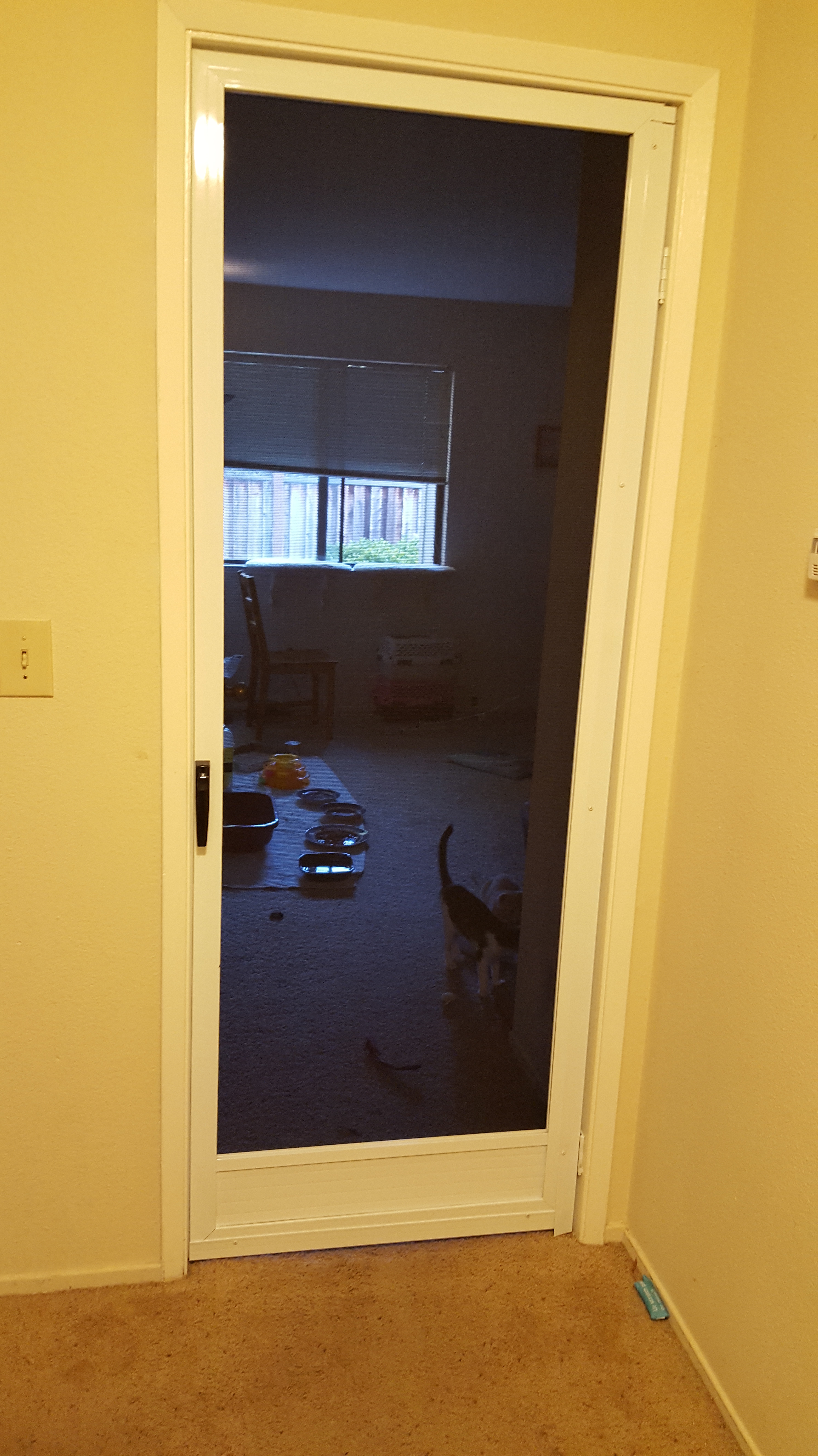 Earlier this year we started volunteering as part of the The Dancing Cat foster network, a group that cares for cats while they are looking for their forever home. We have two resident cats so keeping a two-week quarantine with foster cats is important to prevent disease transmission, parasite spreading and territorial fighting. We have a separate room for the foster cats, so of course we can close the door to enforce the quarantine, but then we have to deal with escape attempts whenever we open the door. I tried a removable screen but it required constant supervision and ended up too fragile for the task.