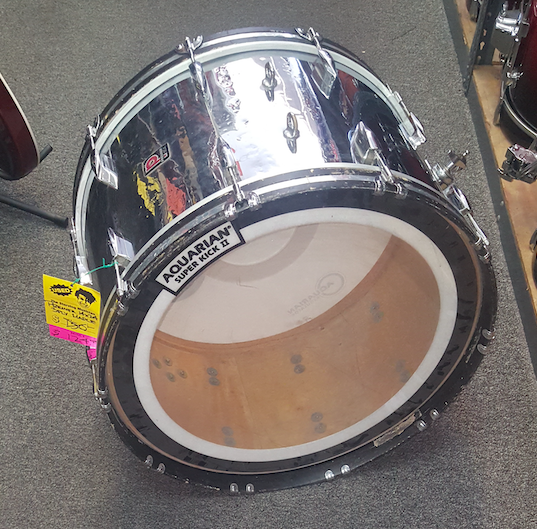 As much fun as I’ve been having with my pancake drum kit, I keep wondering how it would sound with a huge bass drum. One feature of a pancake rack tom is that it leaves plenty of room for big bass drums underneath without having to raise the height as you would with a traditional two-headed rack tom. After a little searching I found this old beast – a 1970s 14″x24″ Premier marching bass drum converted to a drum kit bass drum. When you take a picture of an instrument in a music store you know you’ll be back…